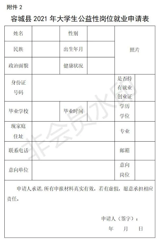 持本人身份證、戶口本、畢業證原件復印件和《容城縣2021年大學生公益性崗位就業申請表》到容城縣政務服務中心六樓611室報名。
