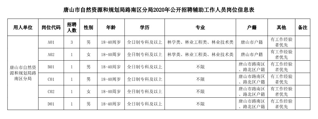 4.具有全日制大專及以上學(xué)歷,專業(yè)、資格、年齡等條件詳見(jiàn)《唐山市自然資源和規(guī)劃局路南區(qū)分局2020年公開招聘輔助工作人員崗位信息表》;