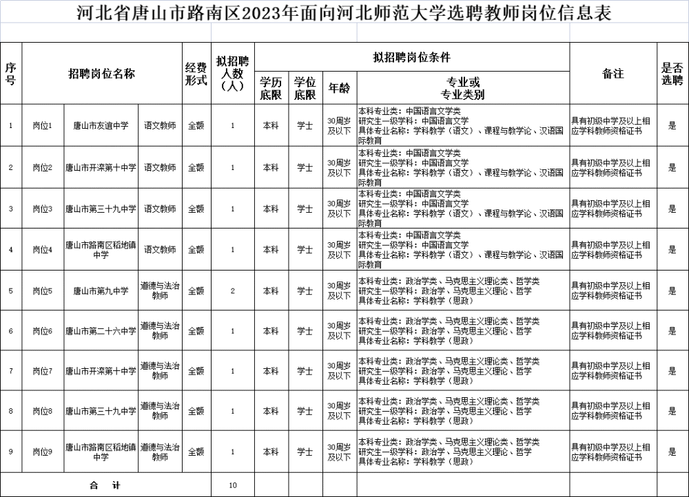 本次選聘事業單位編制教師共10名,語文教師4名、道德與法治教師6名。具體選聘人數和崗位條件詳見《河北省唐山市路南區2023年面向河北師范大學選聘教師崗位信息表》。