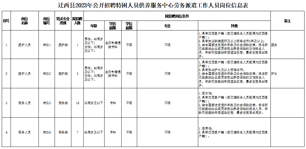 遷西縣2023年公開招聘特困人員供養服務中心勞務派遣工作人員崗位信息表