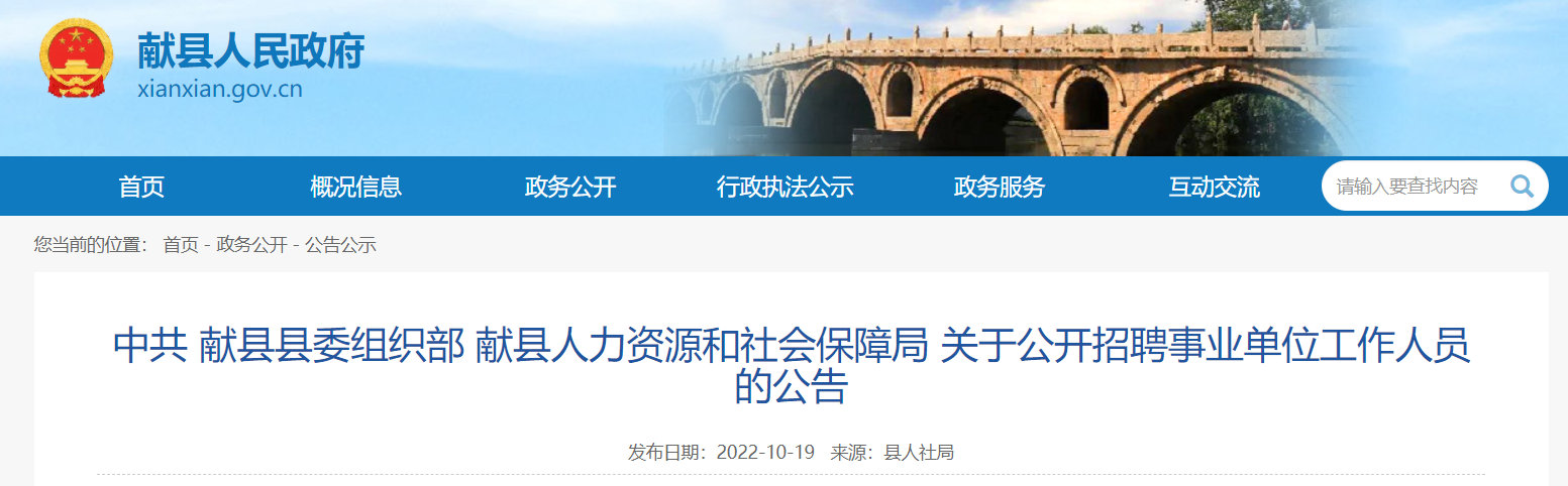 通過獻(xiàn)縣人民政府(http://www.xianxian.gov.cn/)面向社會(huì)發(fā)布《獻(xiàn)縣2022年公開招聘事業(yè)單位工作人員公告》。公告發(fā)布時(shí)間不少于7個(gè)工作日。