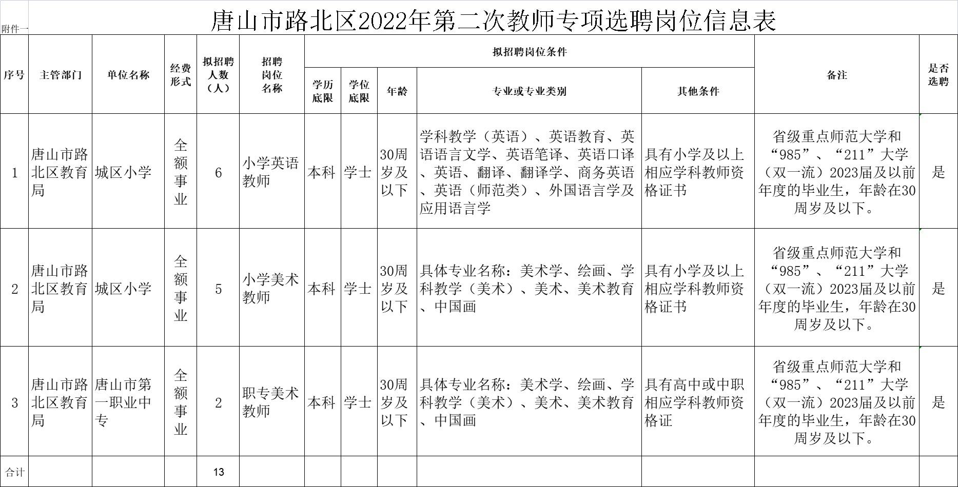 選聘事業(yè)編制教師13名,具體選聘人數(shù)和崗位條件詳見《唐山市路北區(qū)2022年第二次教師專項(xiàng)選聘崗位信息表》。各學(xué)科教師招聘數(shù)額根據(jù)報(bào)名實(shí)際情況可做適當(dāng)調(diào)劑。