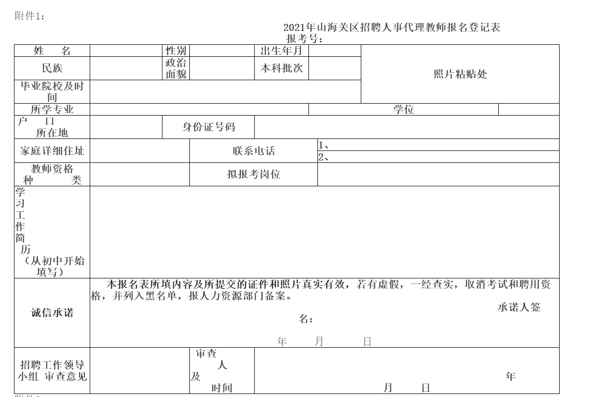 3.報名手續:符合條件人員報名時需攜帶畢業證及學信網在線查驗報告、報到證(或人才中心出具的檔案保管證明及報到證復印件)、戶口本、身份證、教師資格證書(已通過教師資格考試并現場確認、但未拿到教師資格證人員,可持筆試成績單和面試合格證明)(2021年畢業生已取得教師資格,教師資格證未下發的,需帶由所在學校出具的已考過的相應教師資格證明)等相關資料的原件和復印件(一份)、1寸近期免冠紅底彩色照片4張(2張貼在報名登記表上,2張做準考證用)。公辦學校教師報名時須持有本單位及其縣級教育主管部門同意的報考證明;民辦學校教師須出具本單位同意報考證明。報名表從山海關區人民政府網自行下載,報名時攜帶填好的《2021年山海關區公開招聘人事代理教師報名登記表》一式兩份。