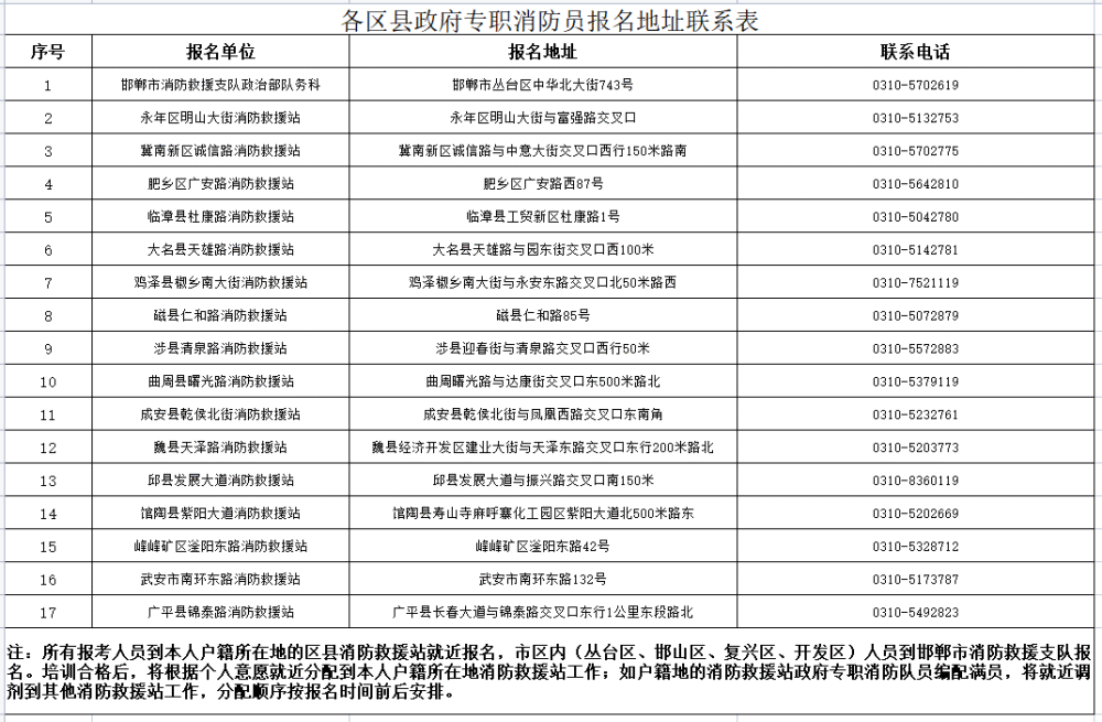 (三)報名地點。報考人員到本人戶籍所在地的區縣消防救援站就近報名。也可到邯鄲市叢臺區中華北大街743號邯鄲市消防救援支隊隊務科報名。具體報名地址和聯系方式見附件。